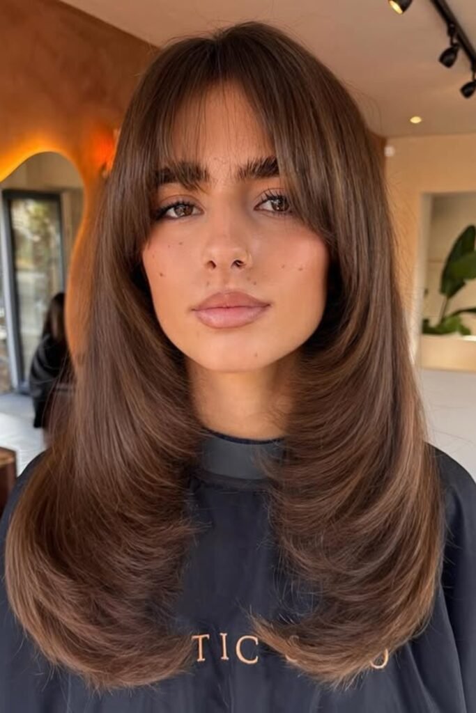 Your straight layers and soft, wispy bangs will instantly give you that effortless cool-girl charm.