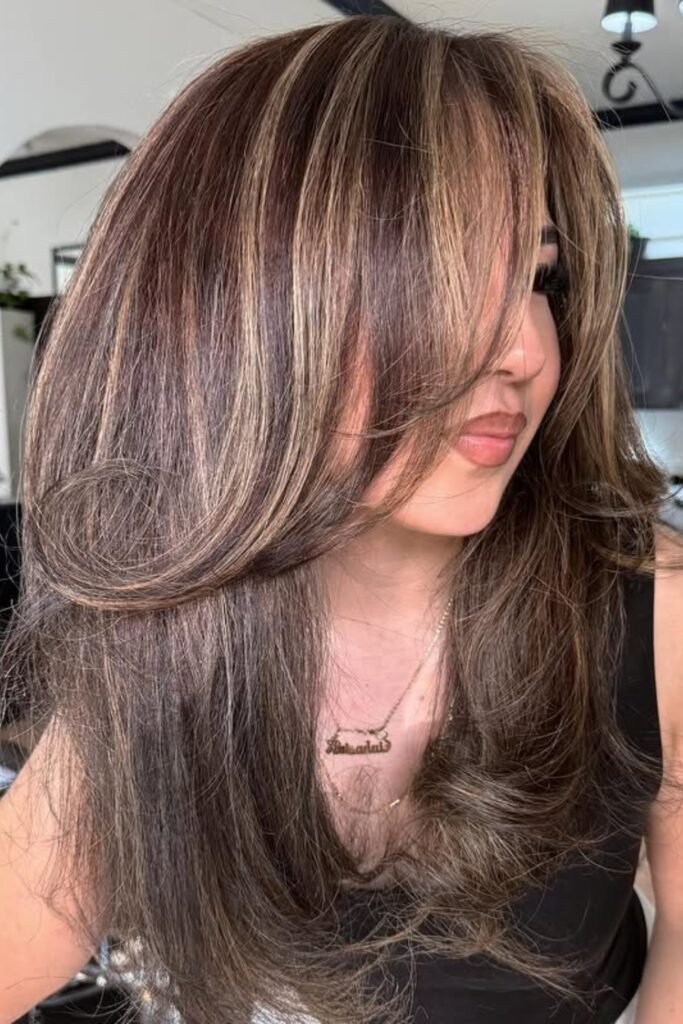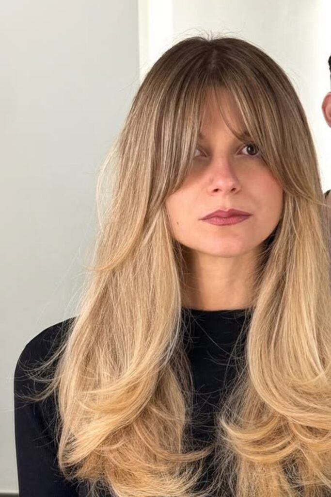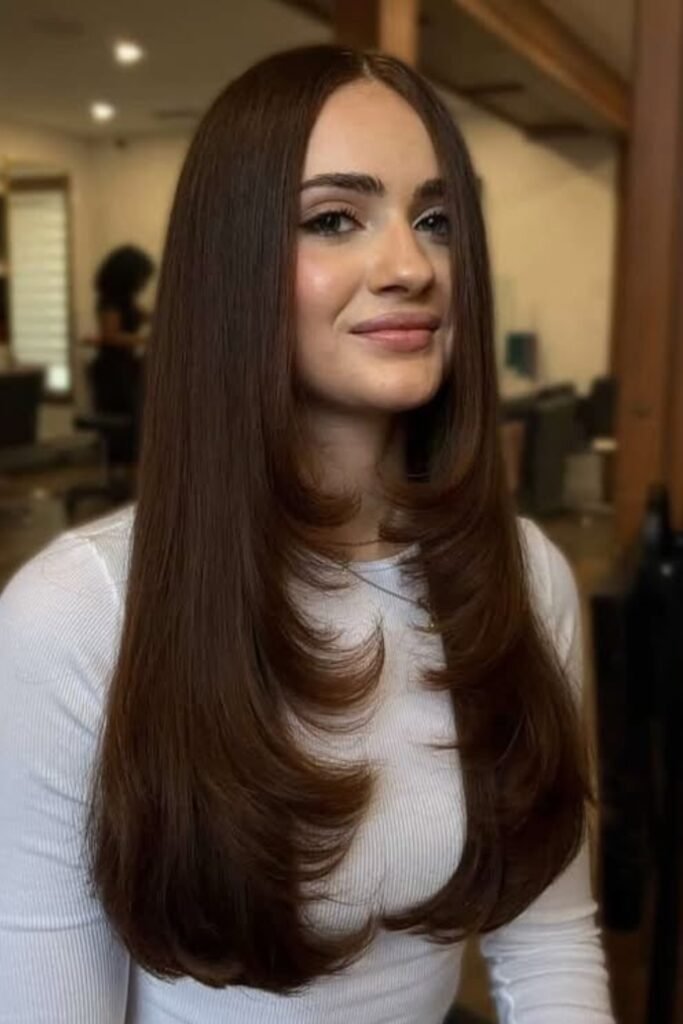The long, feathered layers fall away from your face, creating that light, flowy movement you have seen in every iconic ‘90s look.