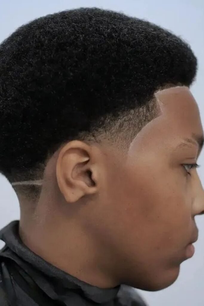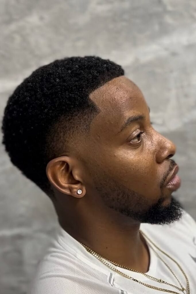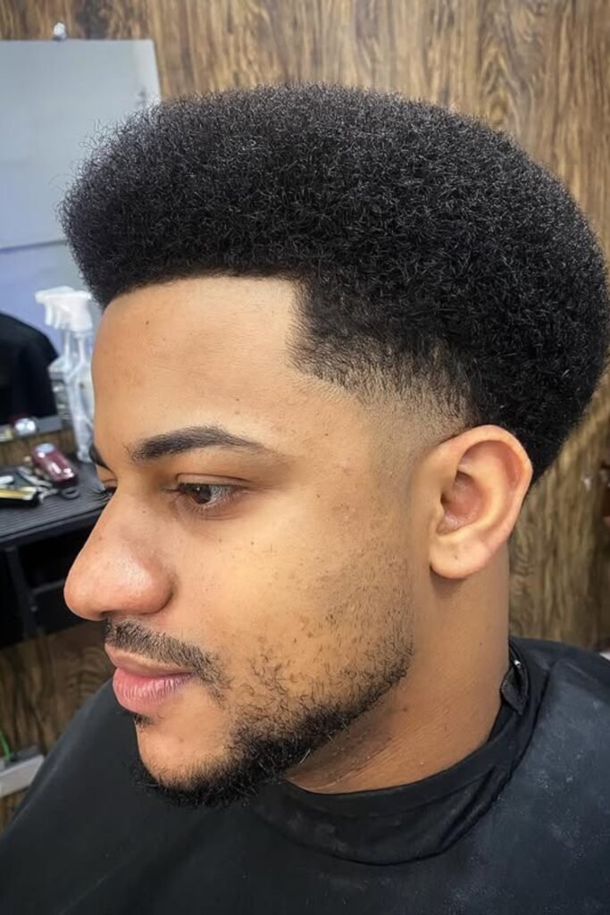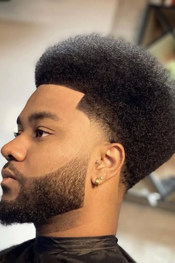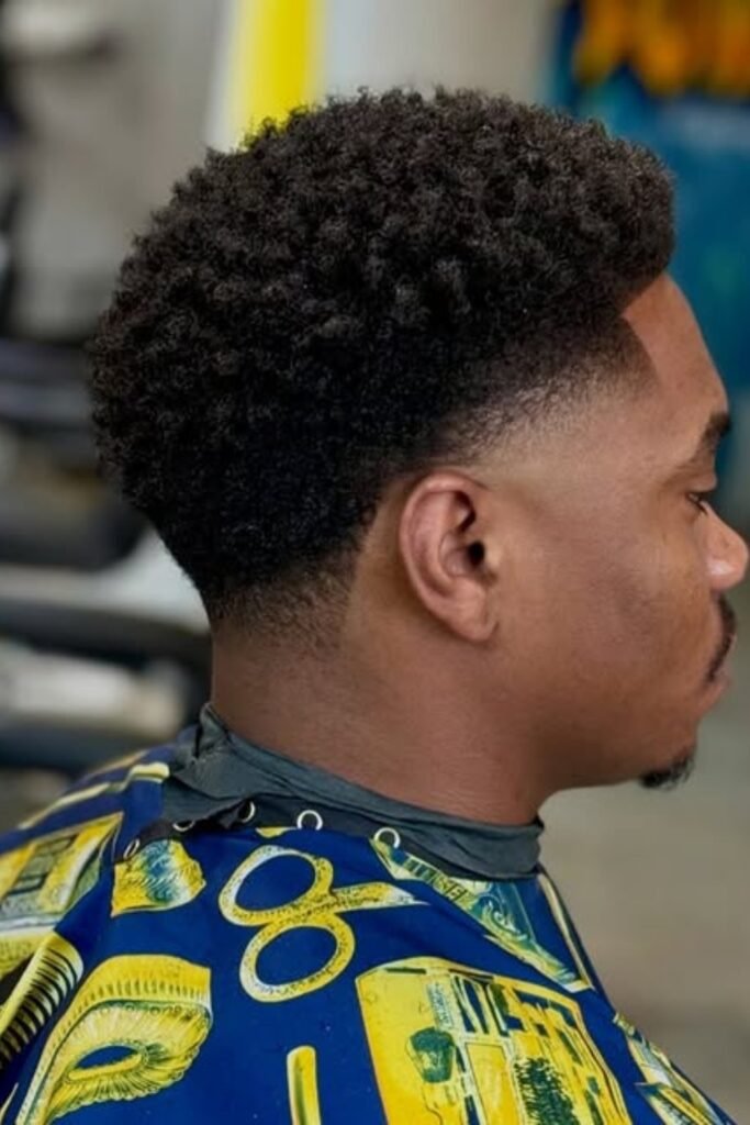 You can make a bold statement with a bowl-shaped afro. You’ll notice the rounded top keeps your hair thick and structured, while a low fade adds contrast.