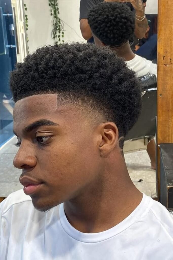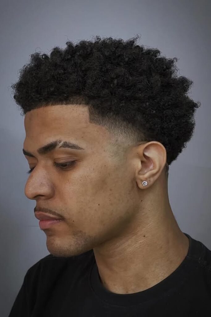 You’ll notice that a full curly afro with a soft fade lets your natural coils create volume while the lower fade keeps your shape neat around your ears and neckline.