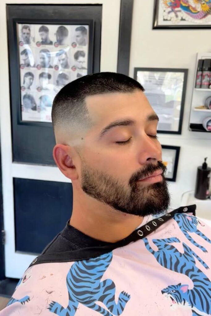 You should ask for skin taken high on the sides, a short even buzz on top, and a crisp beard line to keep the fade from looking unfinished.