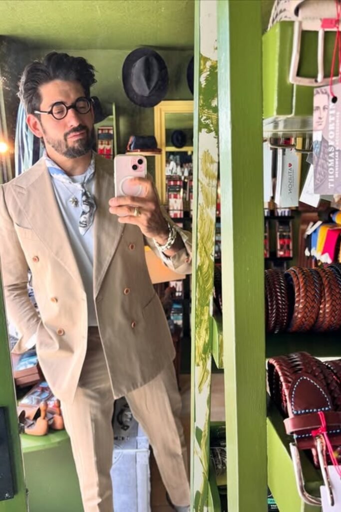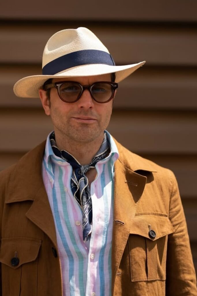 You might wear a beige suit with a light shirt, then tie a soft patterned bandana around your neck instead of wearing a tie.