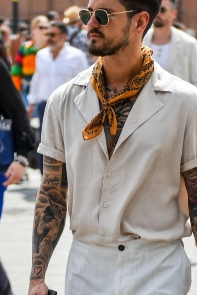 You might pair a short-sleeve beige button-up with matching light trousers, then tie a mustard patterned bandana loosely at your neck.