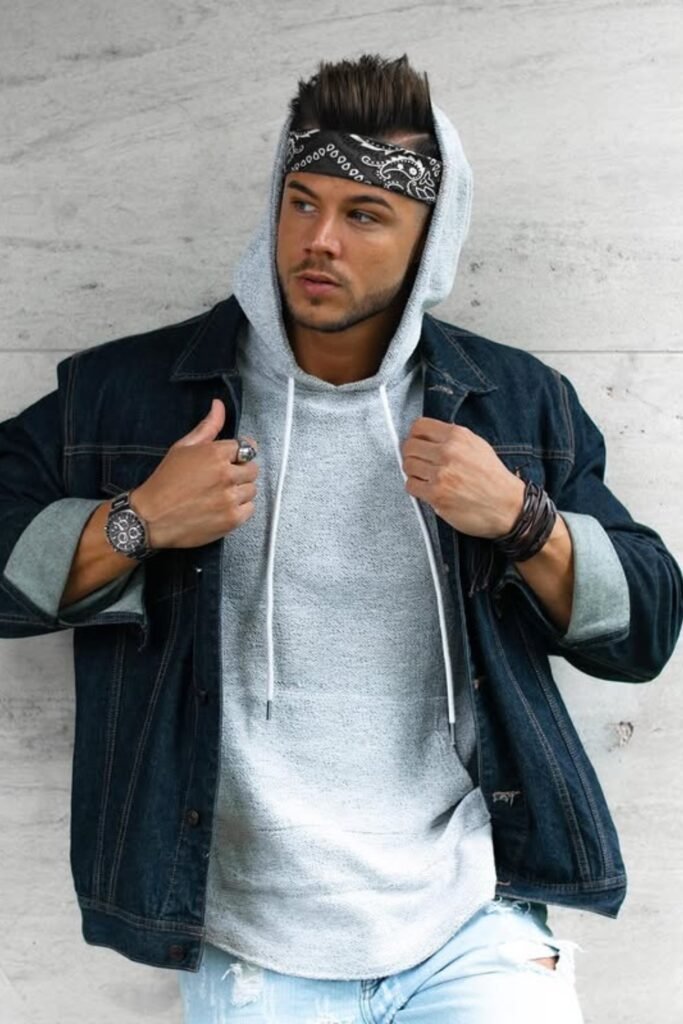 You might start with a gray hoodie, light ripped jeans, and a dark denim jacket, then tie a black bandana as a headband.