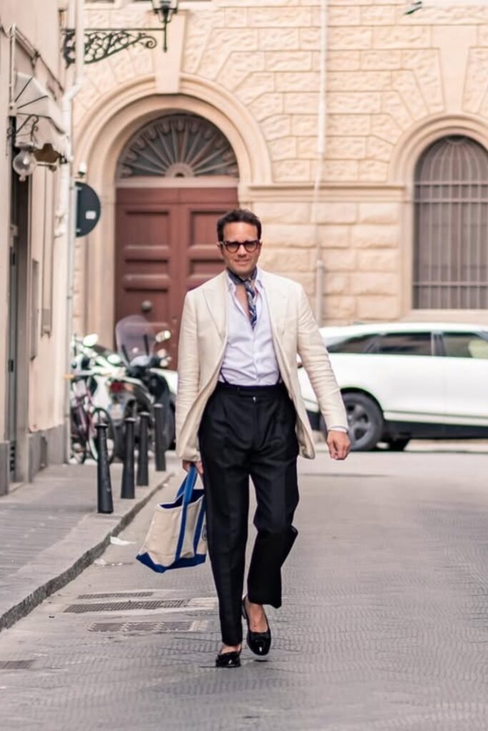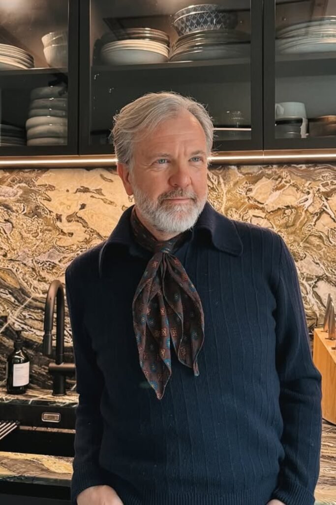 You might pair a light blazer with a crisp button-down shirt and dark tailored trousers, then add a slim patterned bandana at your neck.
