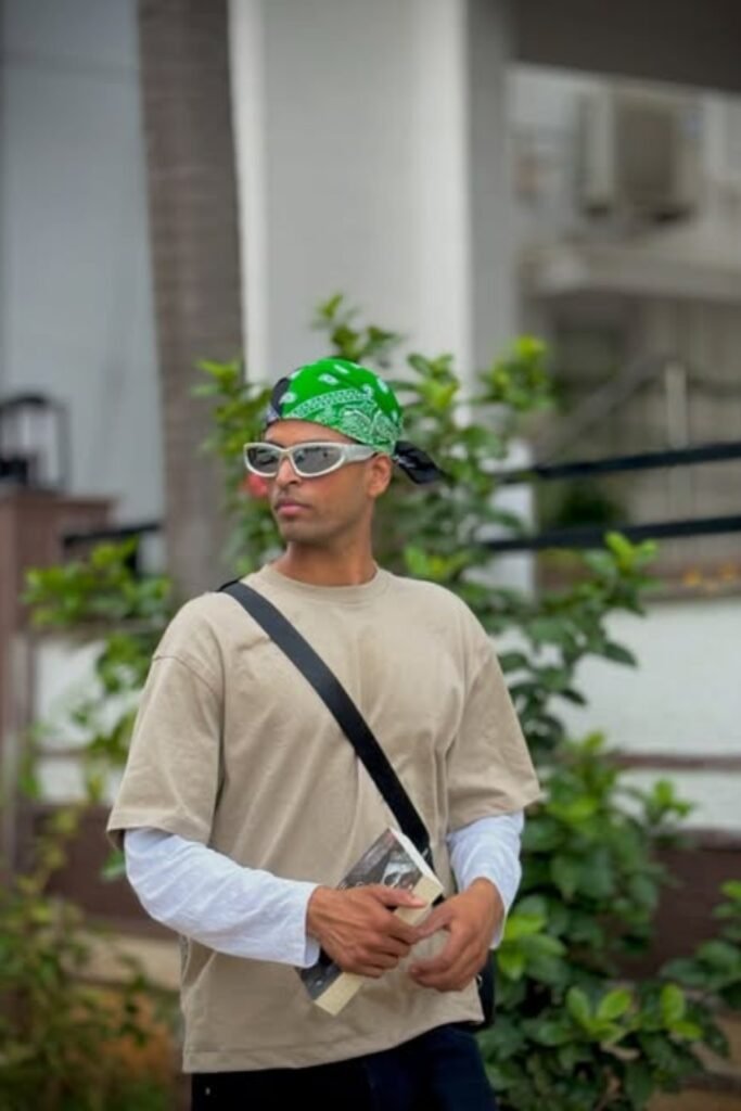 If you’re into streetwear, you can tie a green bandana around your head and keep your outfit relaxed with an oversized beige tee layered over a long-sleeve white top and dark pants.