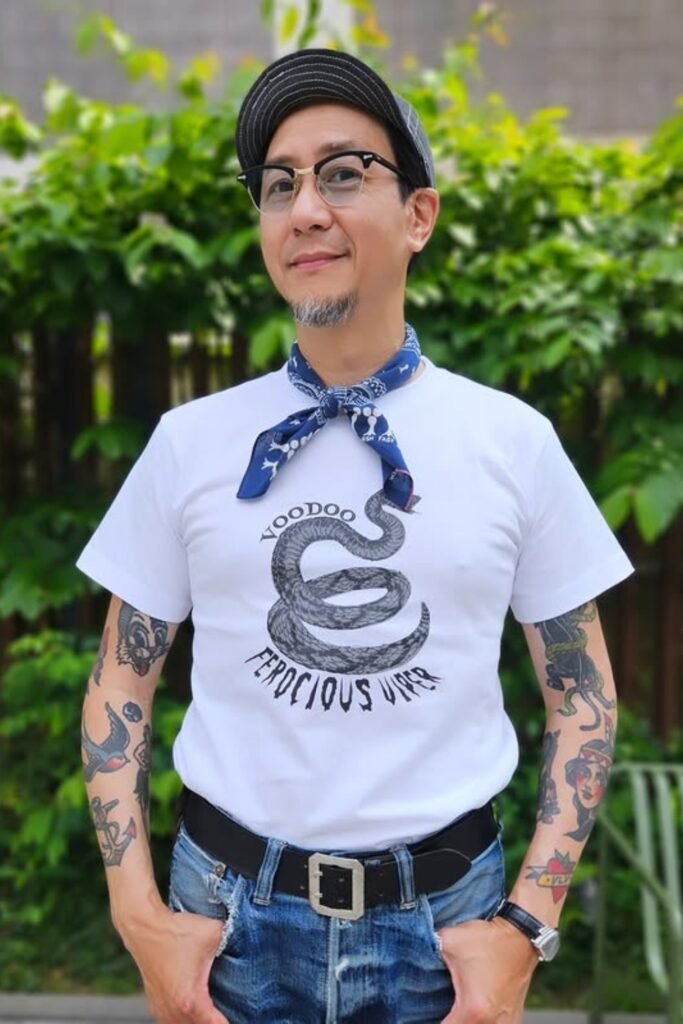 You might wear a graphic white tee with classic blue jeans, then tie a blue bandana loosely at your neck to show personality.