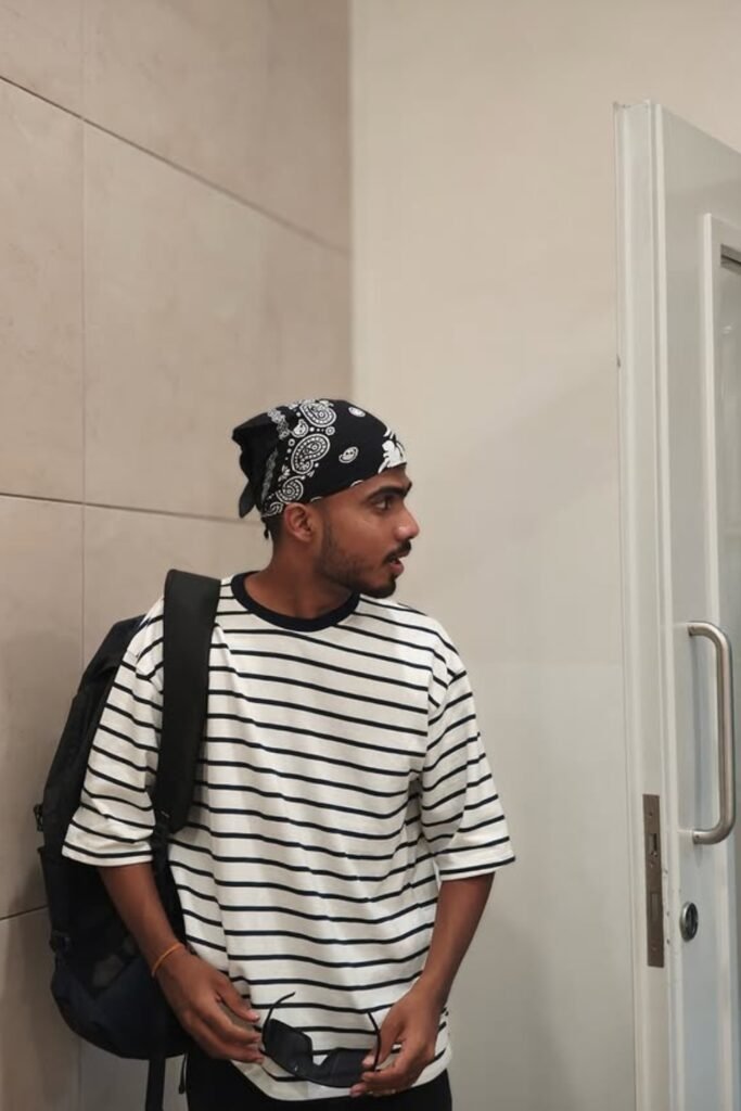 Tie a black paisley bandana over your head, add a striped oversized tee and dark pants, and you’ll notice how sharp it looks while staying simple.