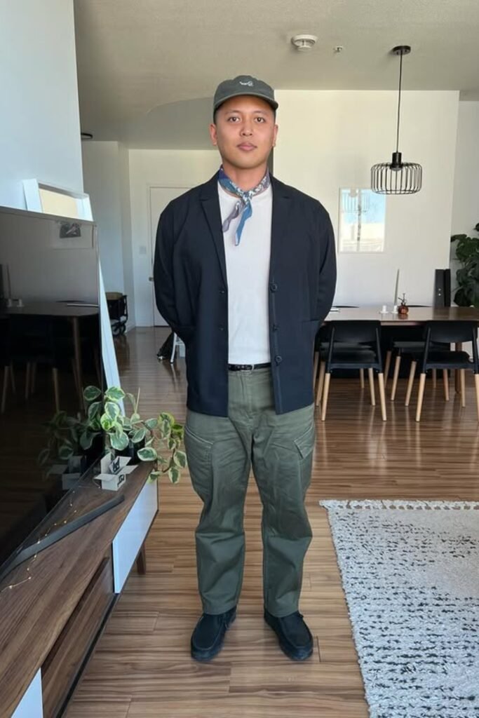 You can pair a simple neck bandana with a light sweater, your navy chore jacket, and olive cargo pants, and you’ll instantly look put-together.
