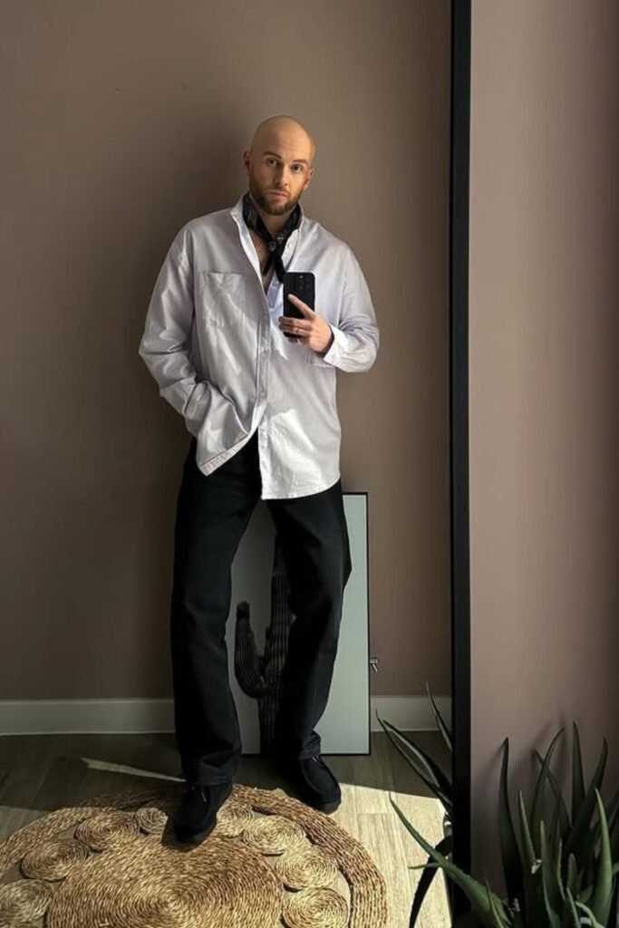 Pair a loose white button-down with black trousers and dark shoes, then add a black bandana for contrast.