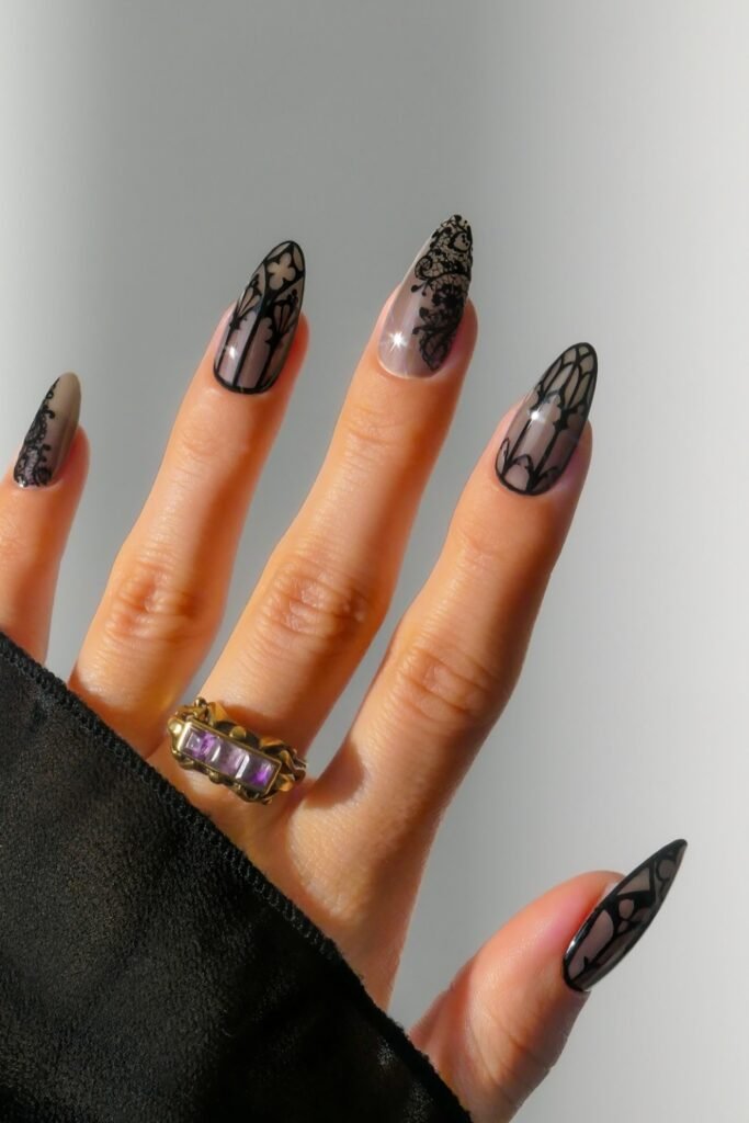 This nail design is perfect if you love black manicures that feel romantic, dramatic, and full of detail.