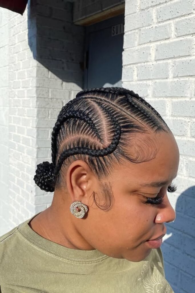 This style takes curved cornrows and pulls them neatly into a low braided bun, which will give you a polished, no-fuss look for the office, school, and formal events.