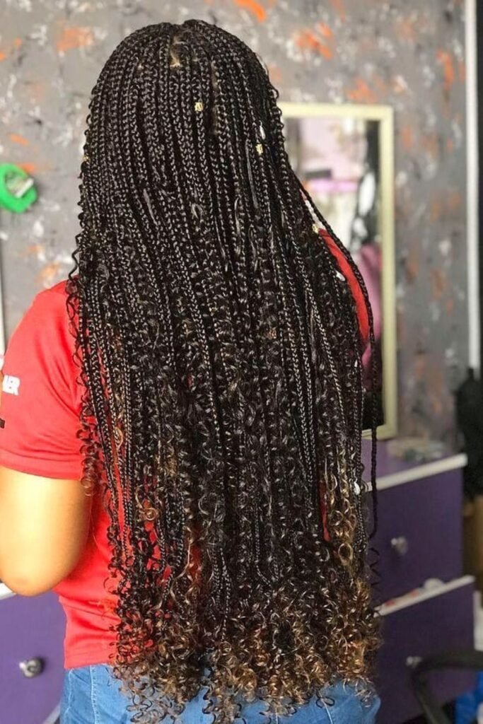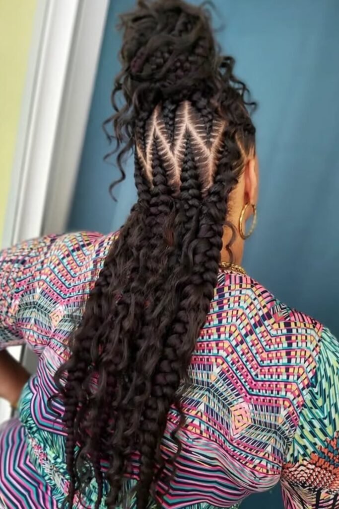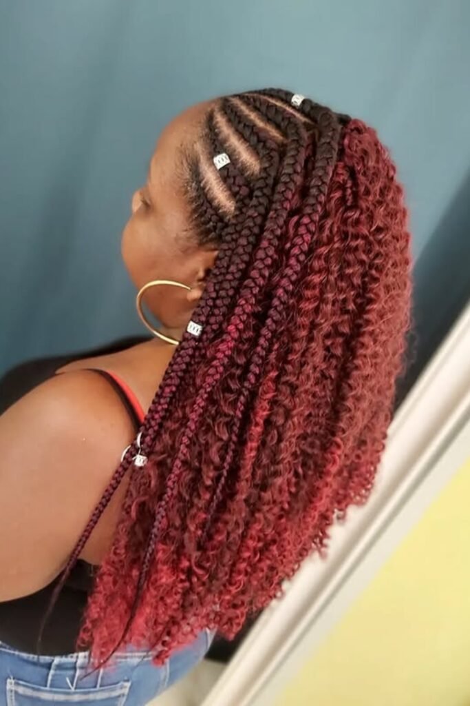 You may love how this style mixes traditional cornrows with loose bohemian curls, giving your hair a full, voluminous look.