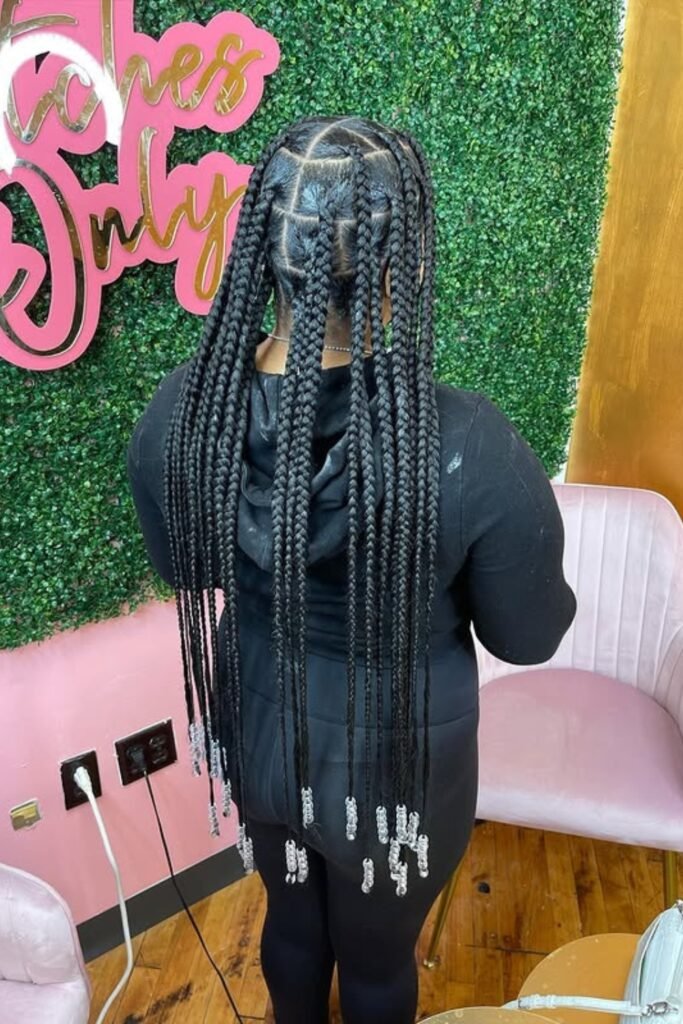 For this look, you’ll need to use jumbo-sized cornrows that flow into long braids, finished with clear beads, for a playful effect.