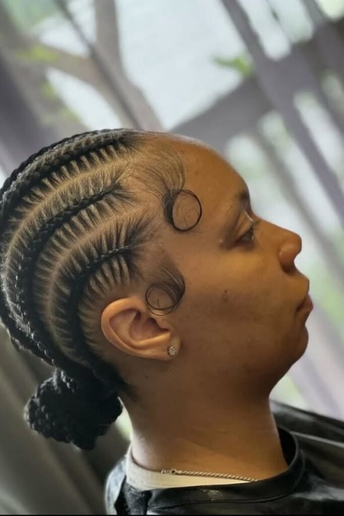 This style features stitch cornrows braided neatly back and gathered into a low bun, resulting in a sharp, professional finish.