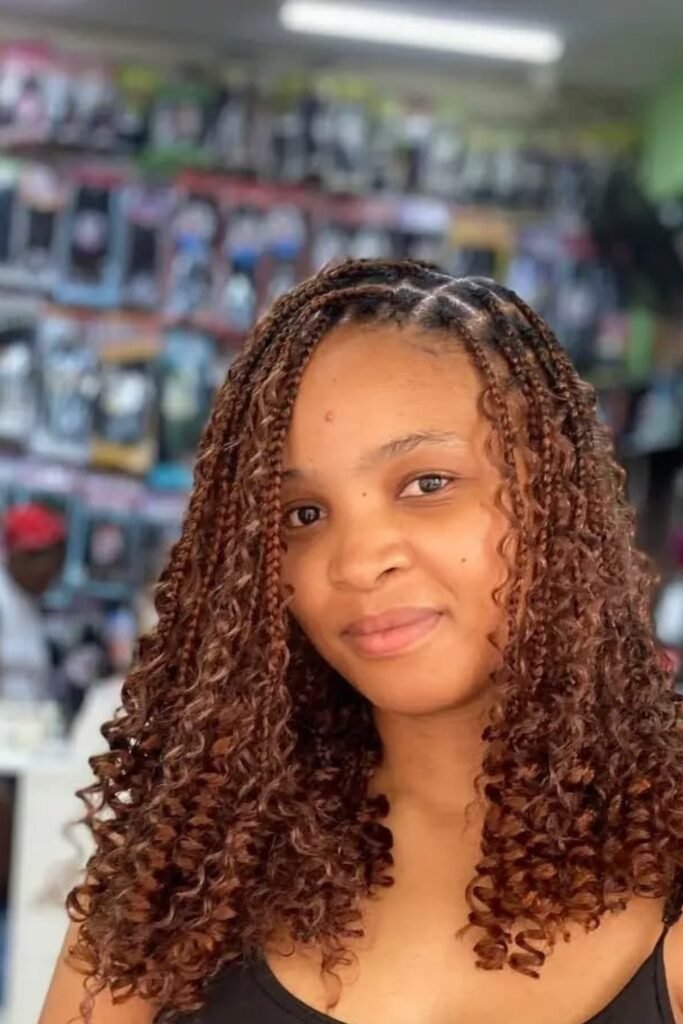 You might love how this style blends slim cornrows at the scalp with shoulder-length curly extensions in a warm brown shade.