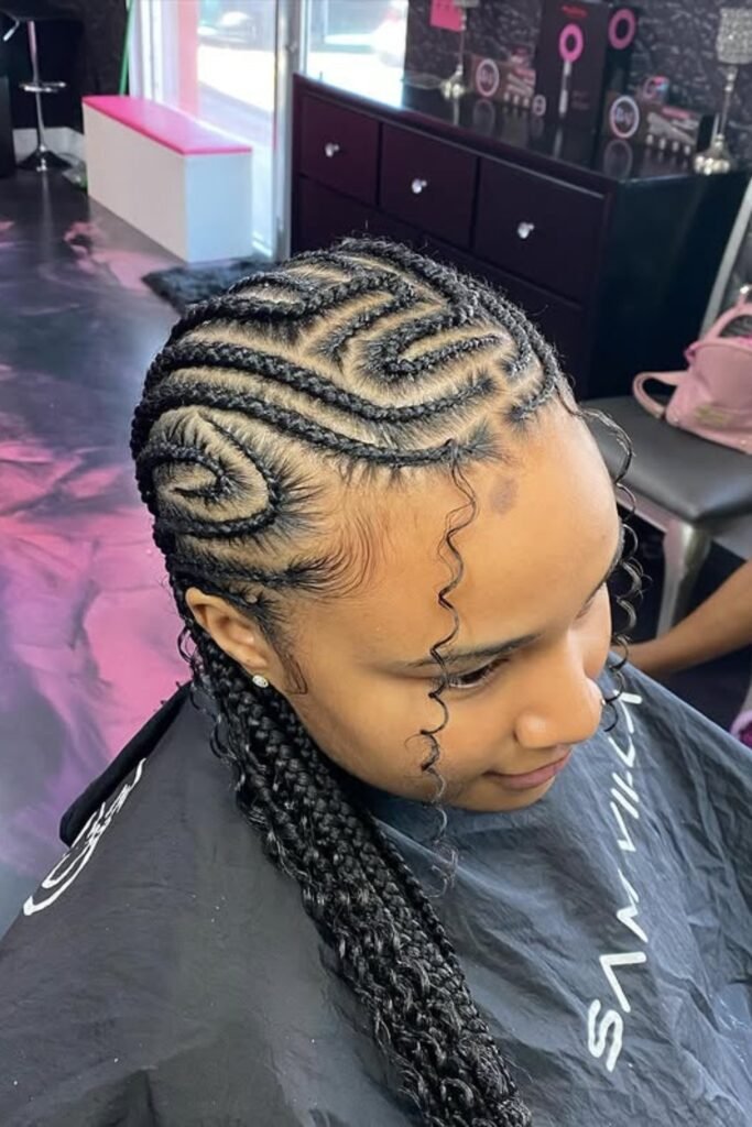 You can notice that this look stands out with swirl-pattern cornrows flowing into a single long braid down your back.