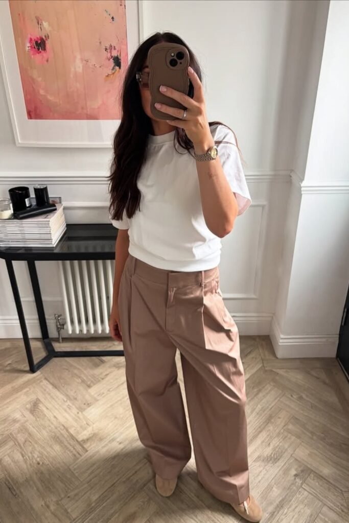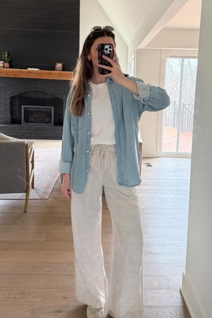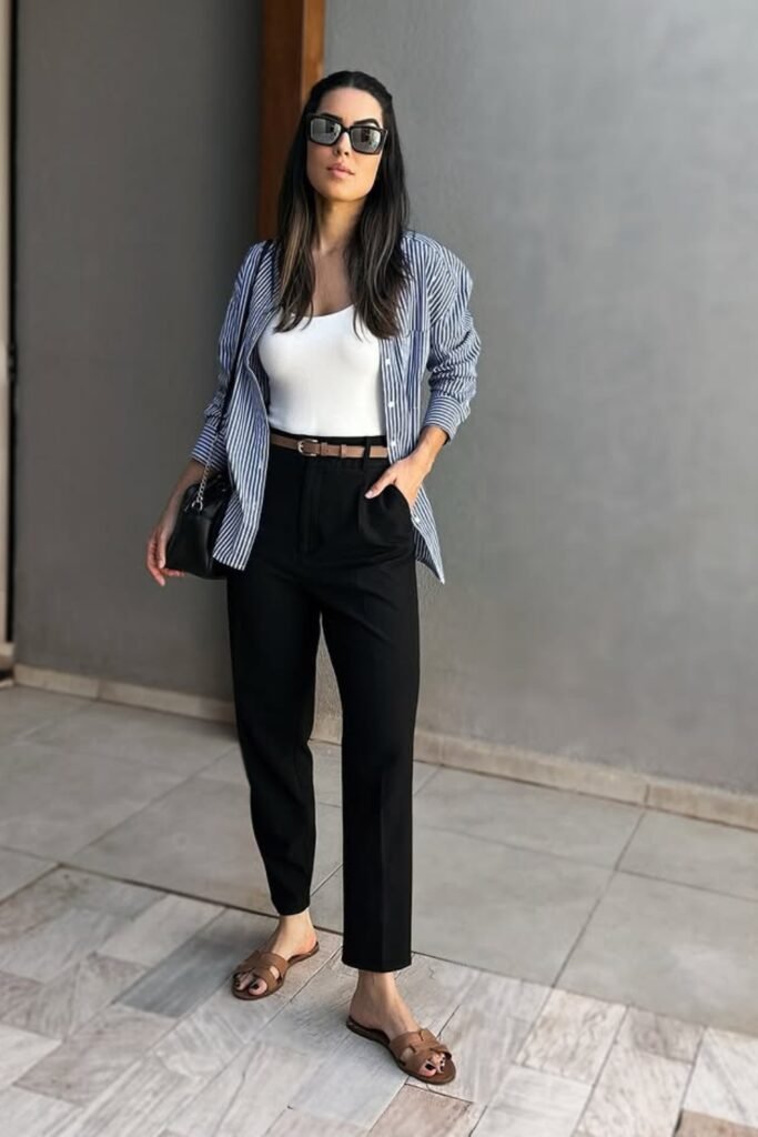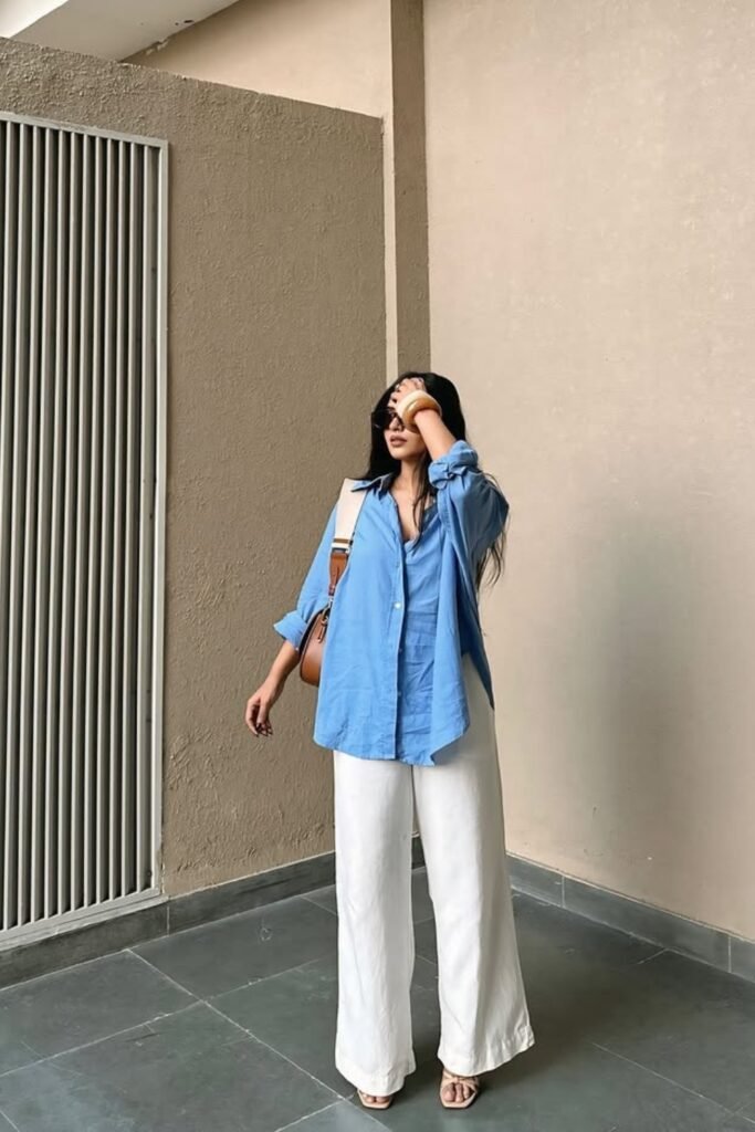 You can choose an oversized shirt with slim bottoms and flats; the mix of loose and fitted makes your outfit feel balanced.
