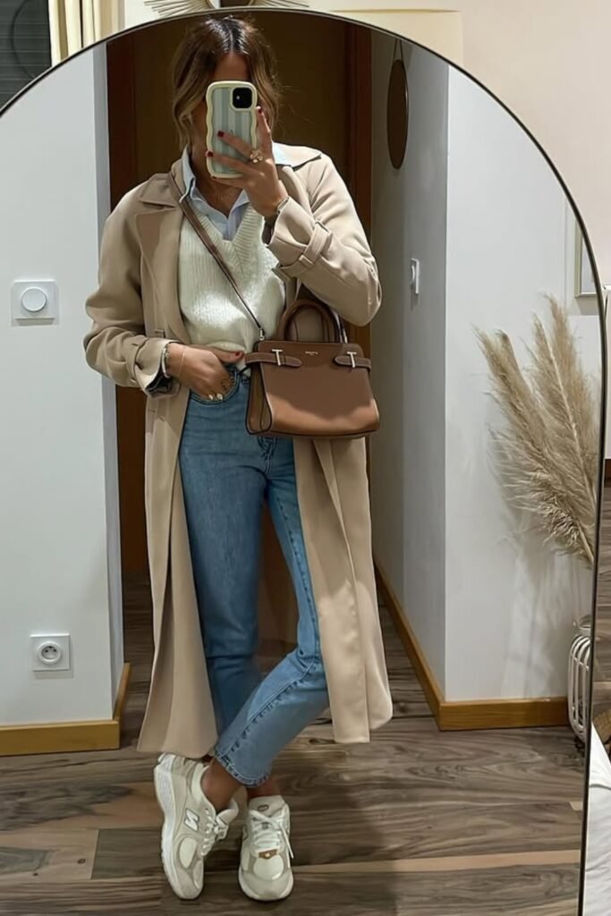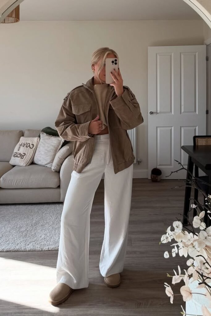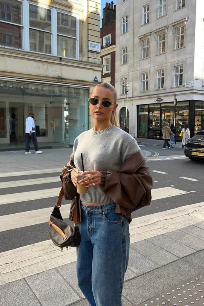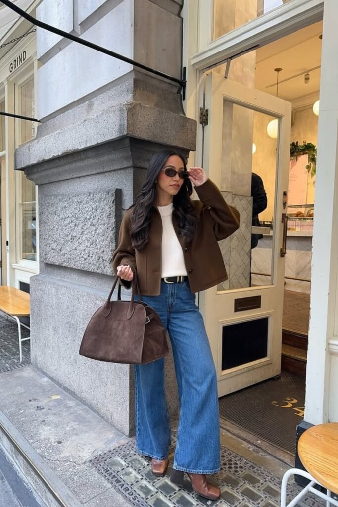 You can start with a neutral knit and wide-leg denim, and you can layer a structured brown jacket to elevate your look.