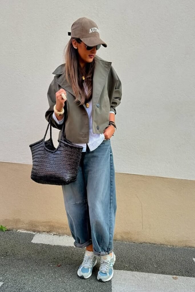 You can style a striped shirt under a cropped khaki jacket, and you will see how you can get that laid-back street vibe.