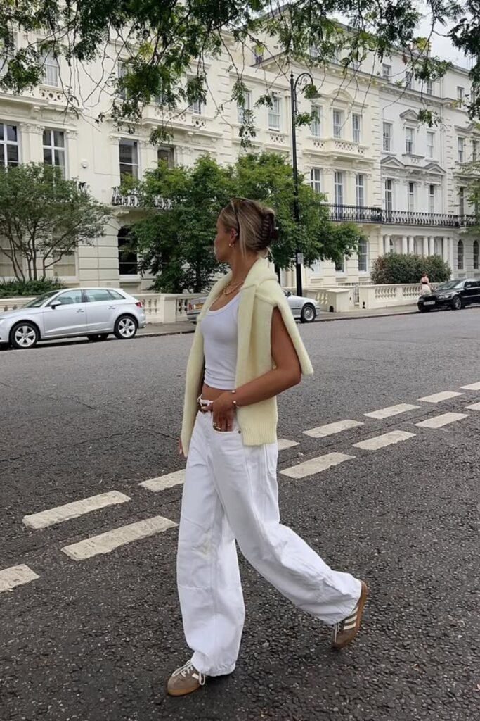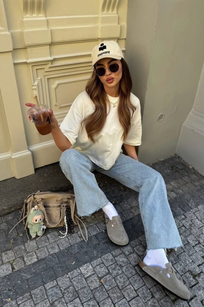 You can pick a plain tee, wide-leg jeans, and white sneakers; it is comfortable, and on top of that, you won’t look sloppy.