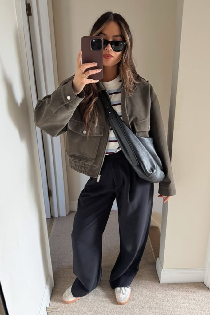 You can layer a striped tee under a cropped khaki jacket to create a casual yet structured base.