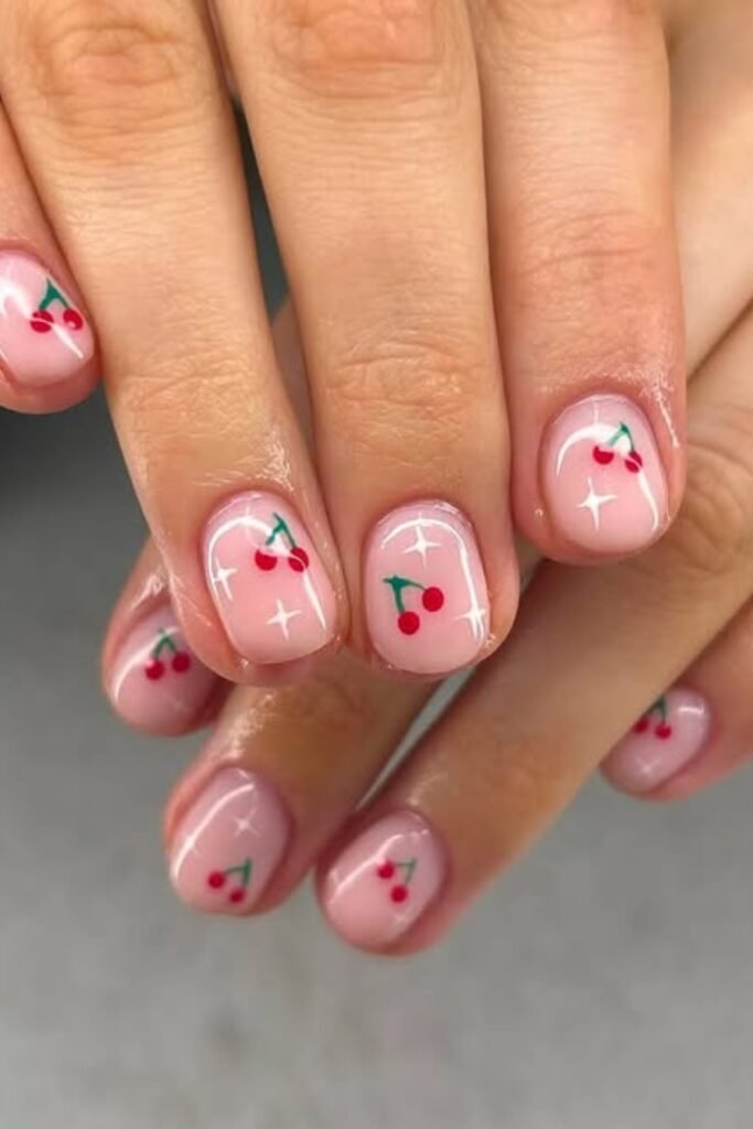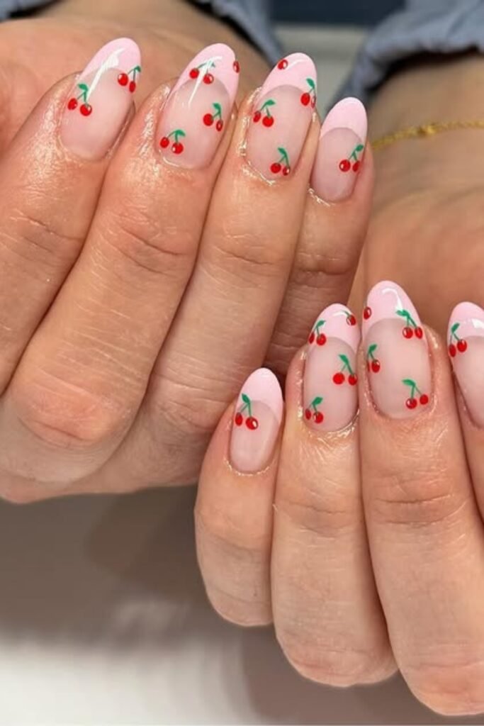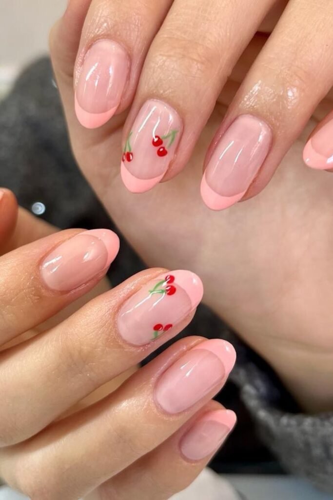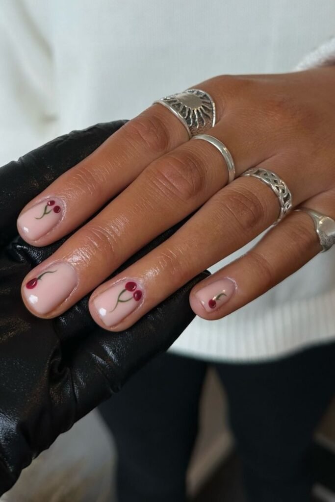 You can go for a sheer nude polish decorated with small cherry art on every nail for a look that’s both simple and stylish.