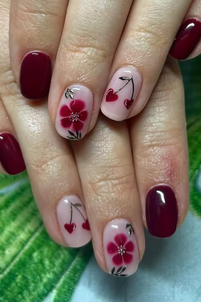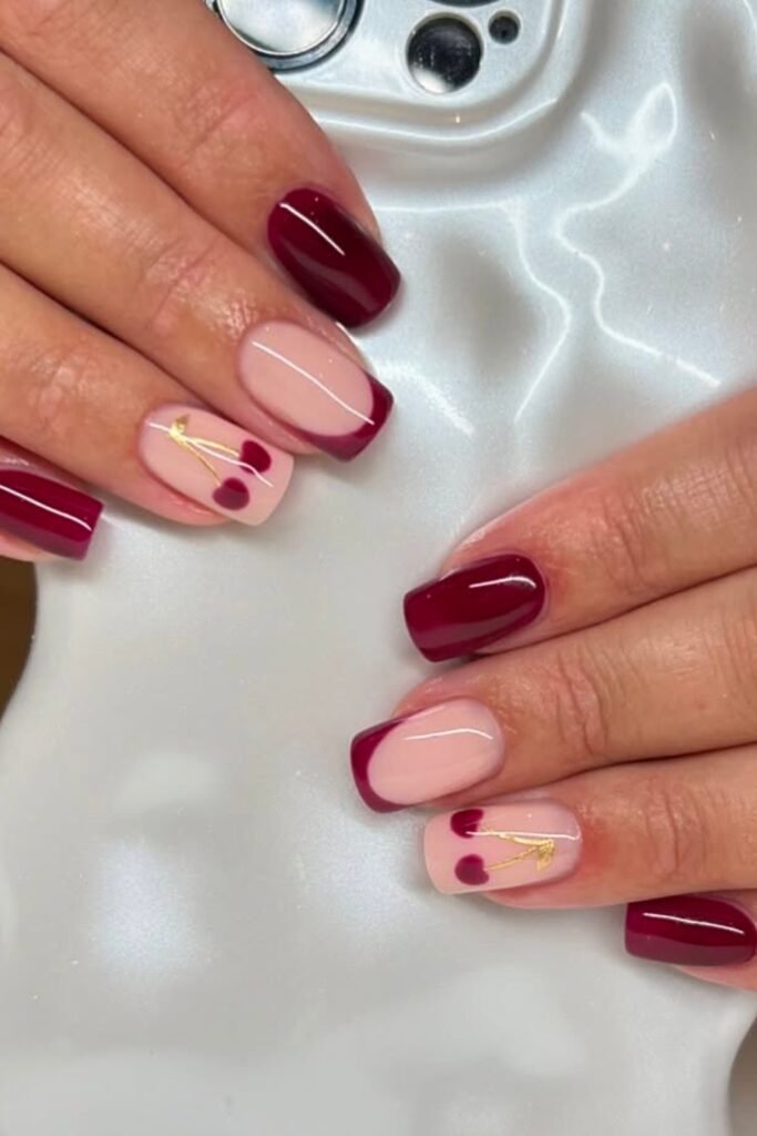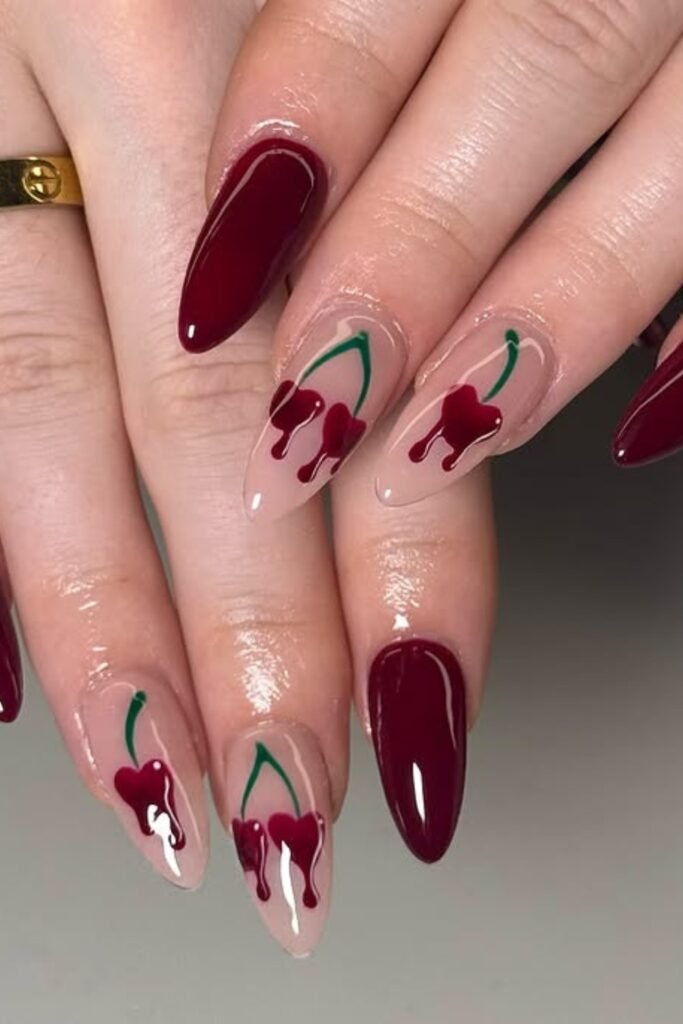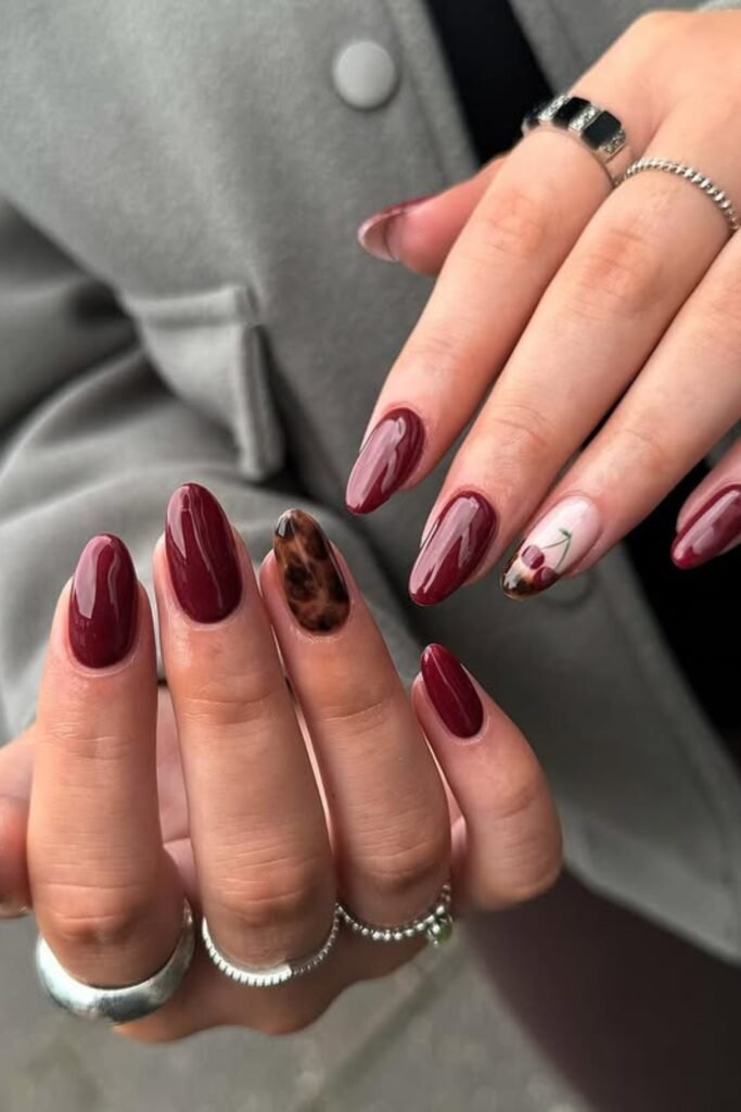 You can go bold with deep burgundy nails and let oversized cherry art steal the spotlight on your accent nails.