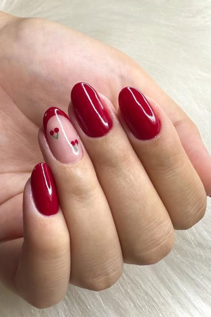 You can wear glossy red nails and let a nude accent with tiny cherries add that playful twist.