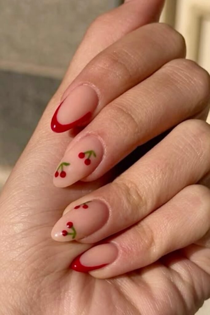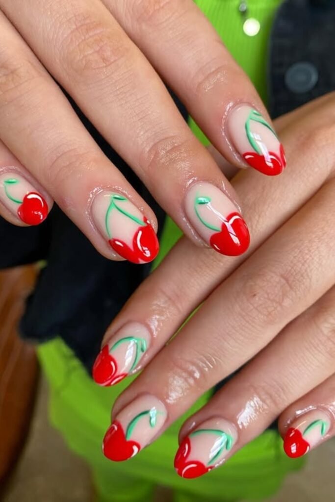 You can make your nails pop by painting bright red cherries across the tips, turning them into a bold and playful statement.
