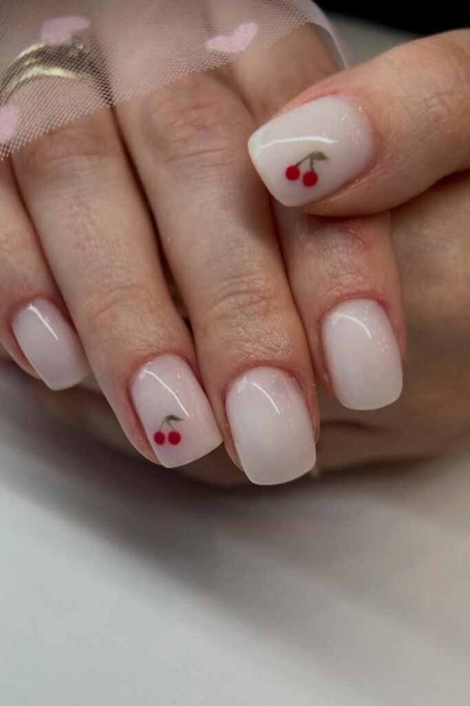 You can keep your nails looking fresh with a soft white base and just a few tiny cherry accents for a delicate vibe.