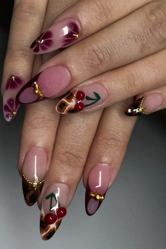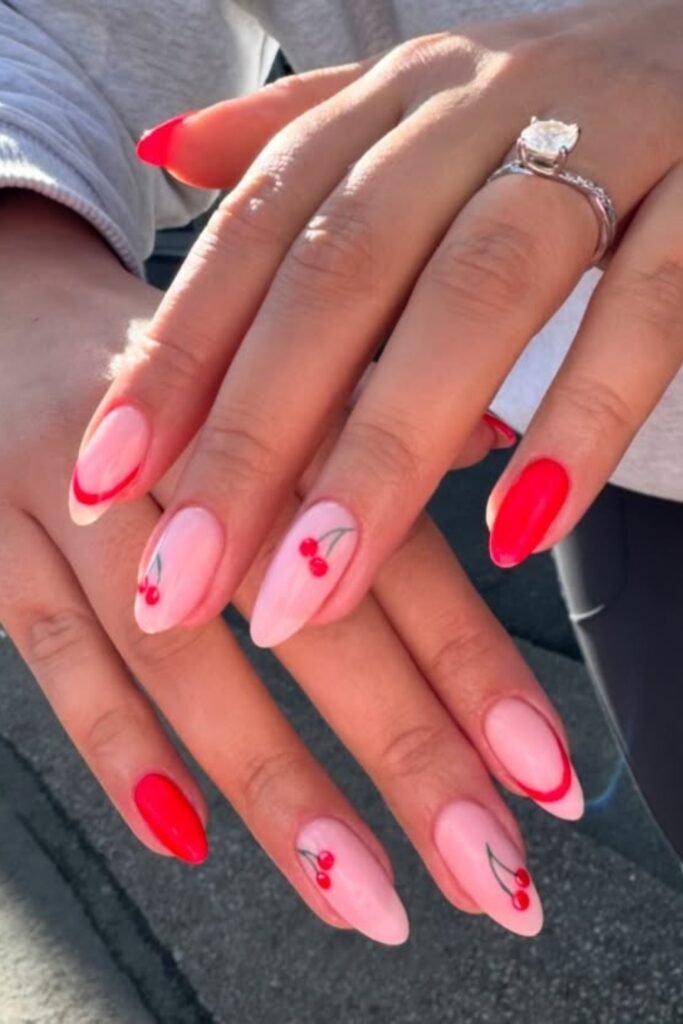 You can start with bold red nails, then add cherries and flowers on a nude base, and suddenly your whole set will feel alive.