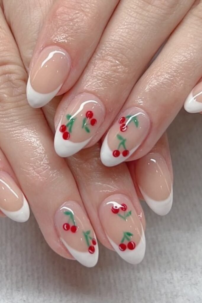 You should try a sheer pink French tip with tiny cherry accents if you want something light and feminine.