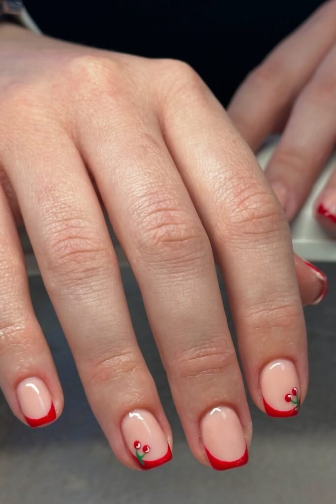 You can turn a simple nude base into something bold with red French tips and cherry accents.