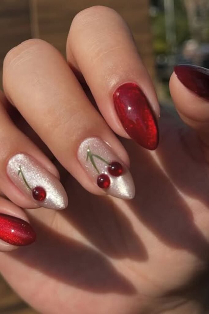 You can pair cherry-inspired red tips with marble accents for a chic twist.