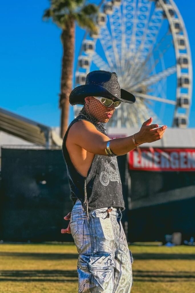 When you add a black cowboy hat and futuristic sunglasses, you’ll push your outfit into true Coachella style, and you can finish with a bandana or face scarf for both style and protection.