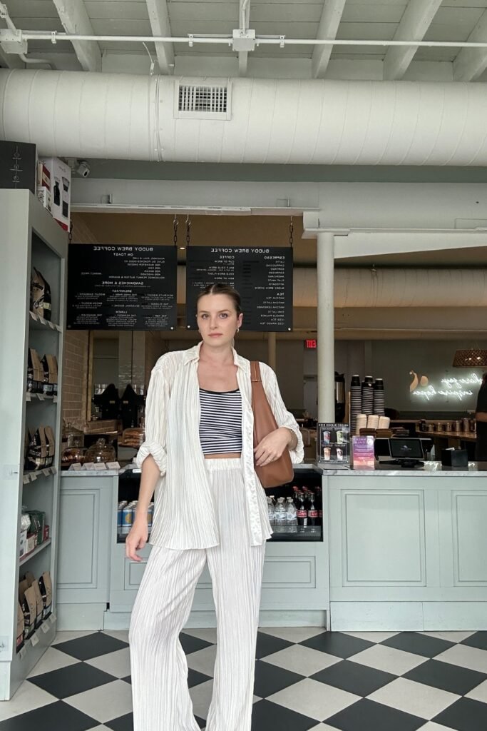 You balance comfort with style effortlessly, making this outfit perfect for brunch or a casual outing, especially when paired with a structured handbag.