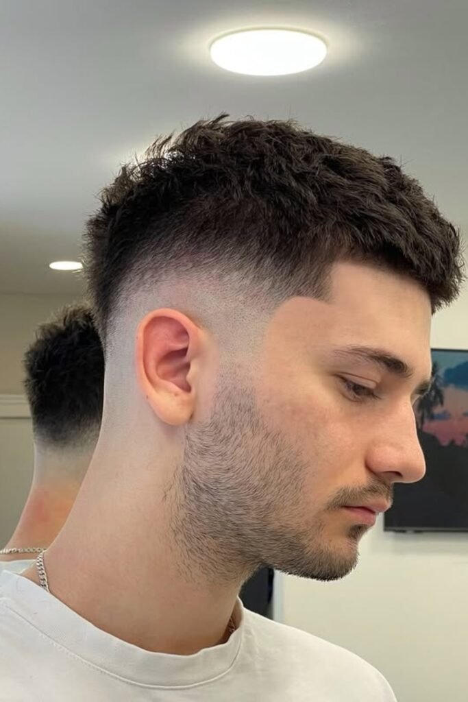 You clear the sides completely with a high skin fade, which makes the short top stand out more and keeps everything crisp for weeks.