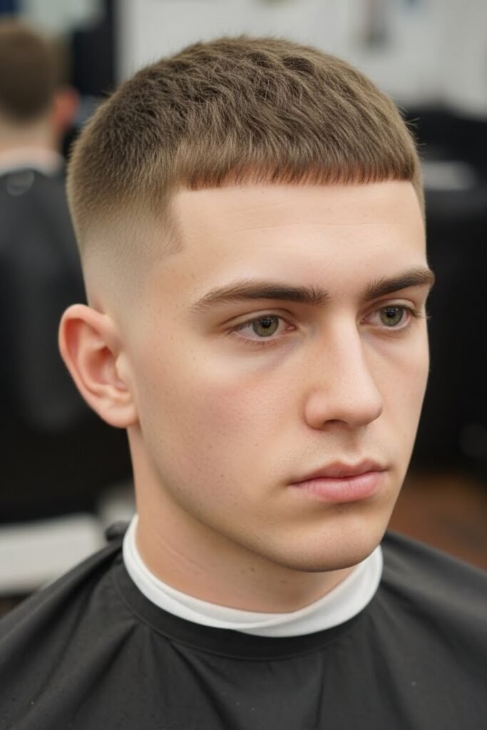 You keep a blunt, textured crop on top so the crew cut stays structured, while a low fade cleans up the sides without pushing you into full skin-fade territory.