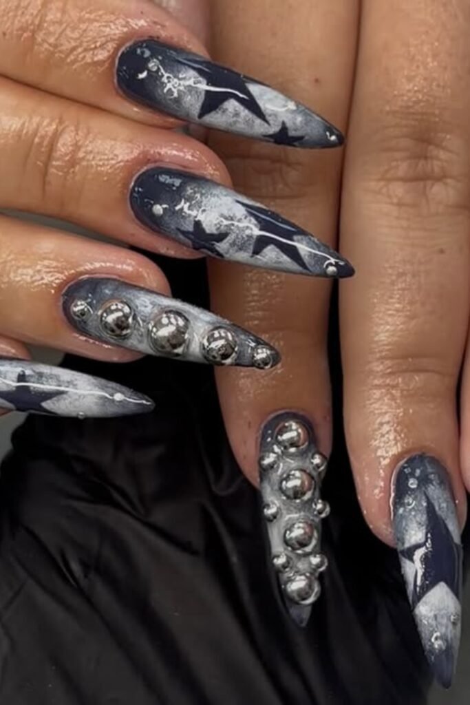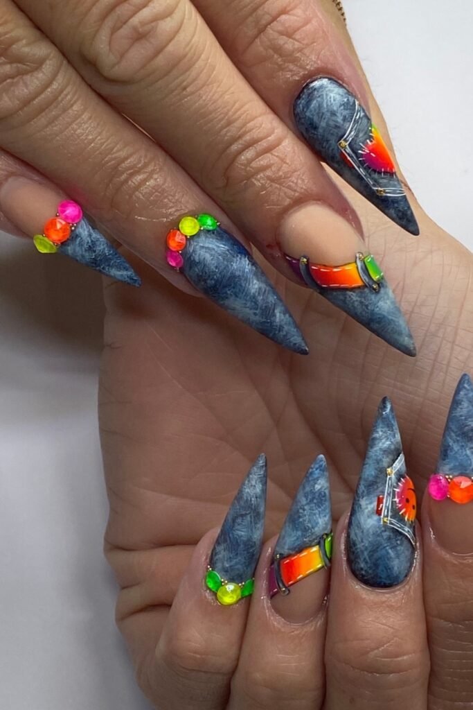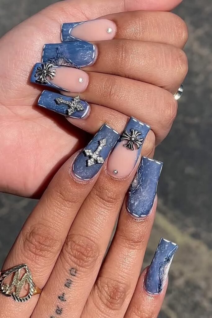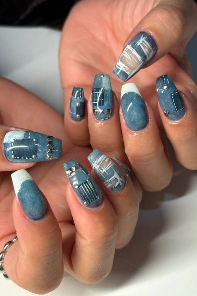 You can recreate it by building a textured denim-blue base first, then adding bright accent pieces or stones near the cuticle.