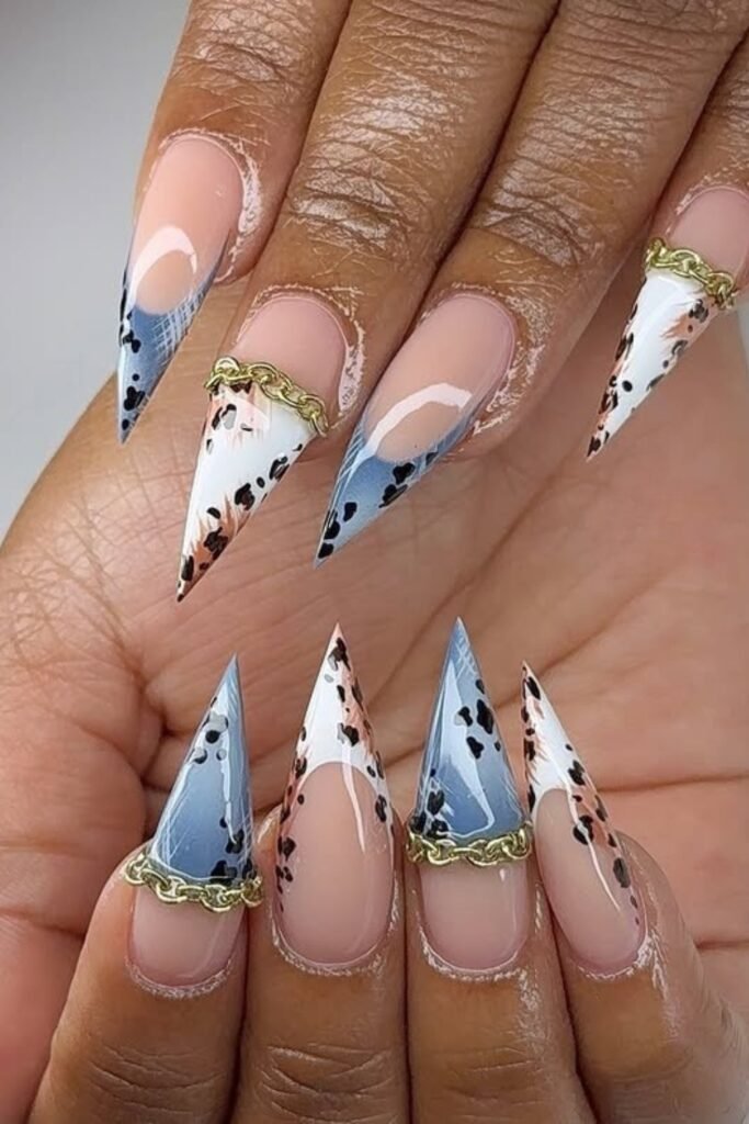 You get a sharp jean-inspired look, while gold chains add a fashion-jewelry vibe. This style works best on long, pointed nails when you want drama.