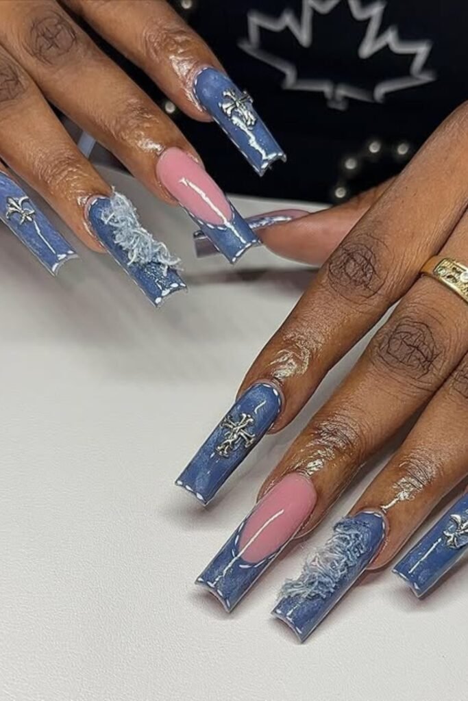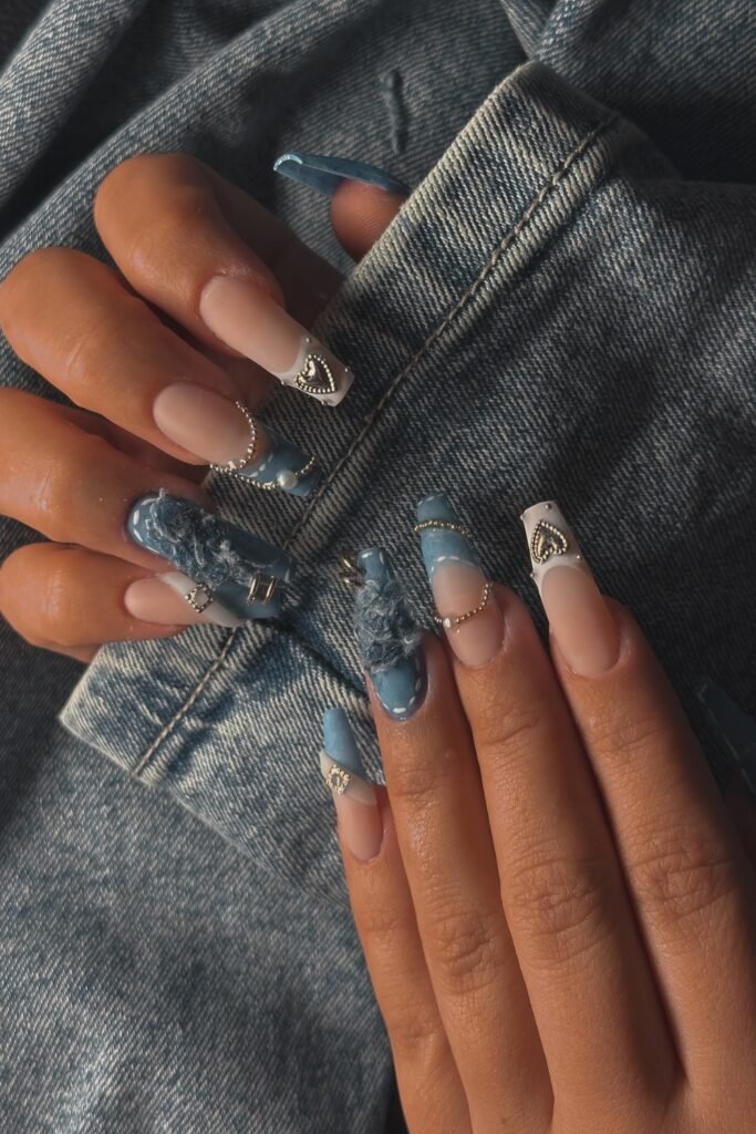 You can stick to solid denim-blue polish, soft fades, or tiny stitched details, they work much better than heavy charms.