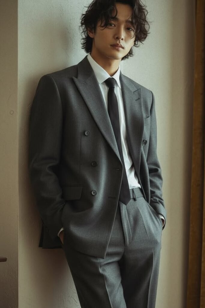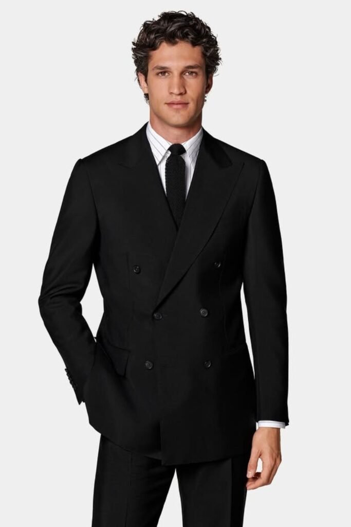 You can pair it with a crisp white shirt and black tie to keep everything clean and balanced. Make sure the jacket fits you well at the waist so the overlap creates a strong shape.