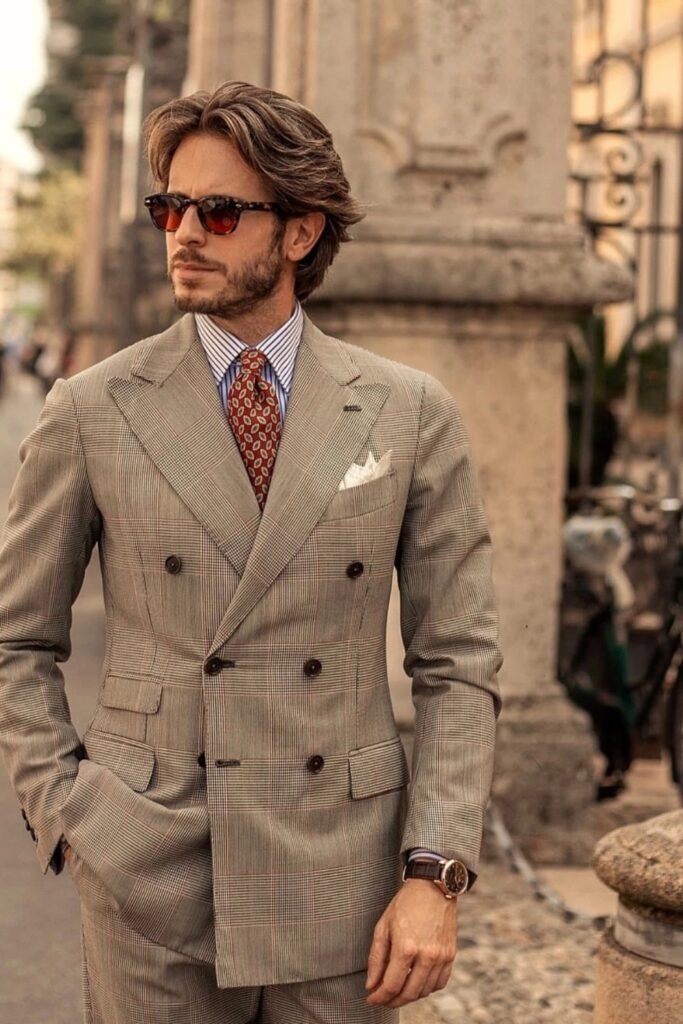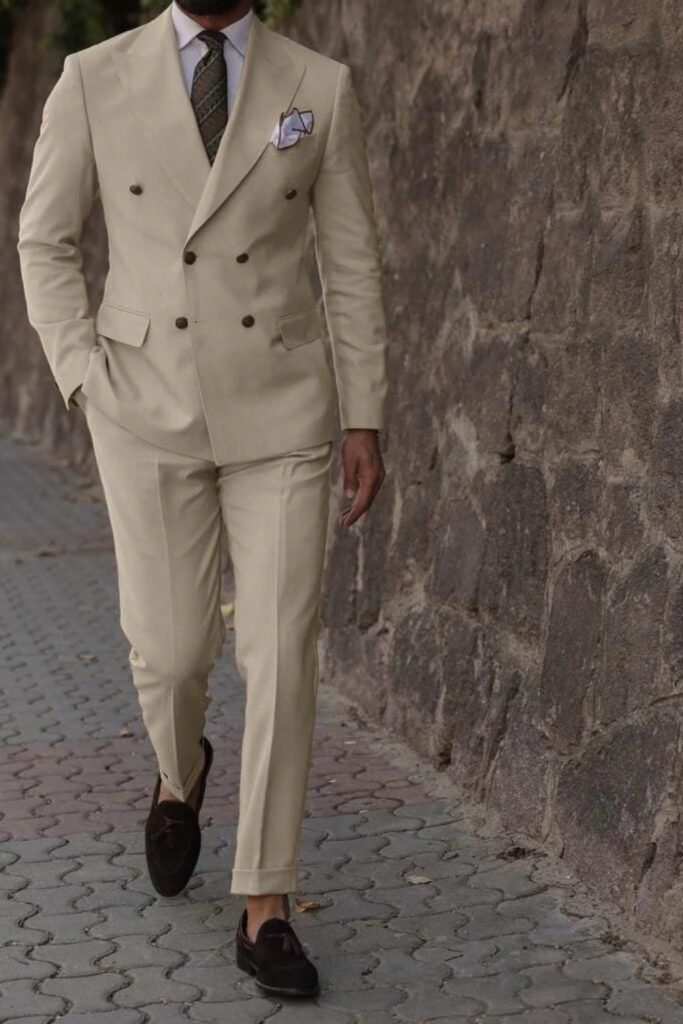 If you choose a beige double-breasted suit with subtle checks, you get a refined daytime look without feeling too formal.