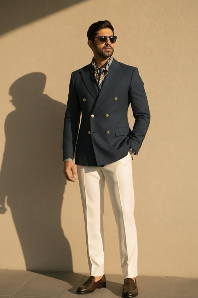 When you go for a navy double-breasted blazer with light trousers, you balance formal and relaxed style instantly.