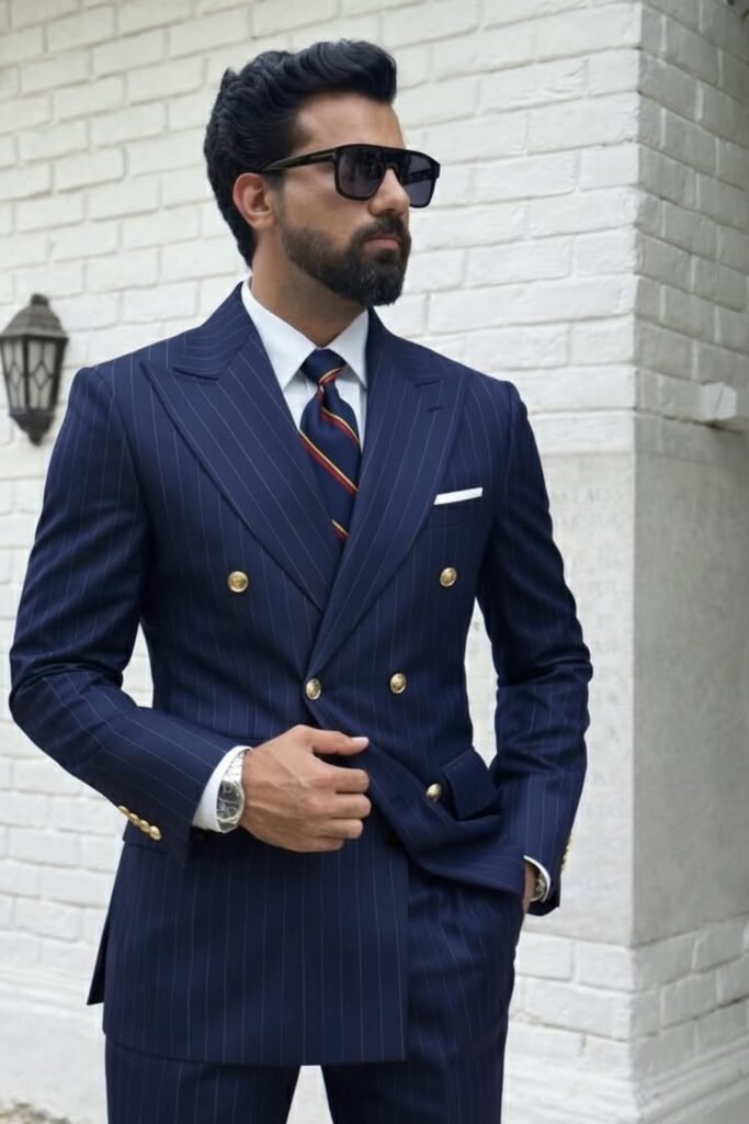 When you wear a navy double-breasted suit with fine stripes, paired with a white shirt and striped tie, you create a strong business look.