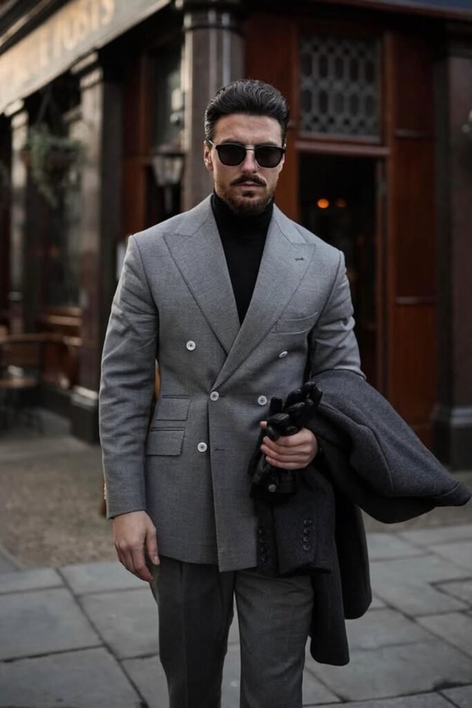 If you wear a grey double-breasted suit with a black turtleneck, you’ll look sharp without needing a shirt and tie.