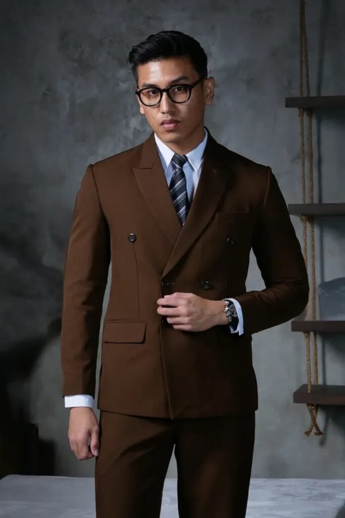 A softer tone like taupe makes you feel calm and refined in a double-breasted suit.