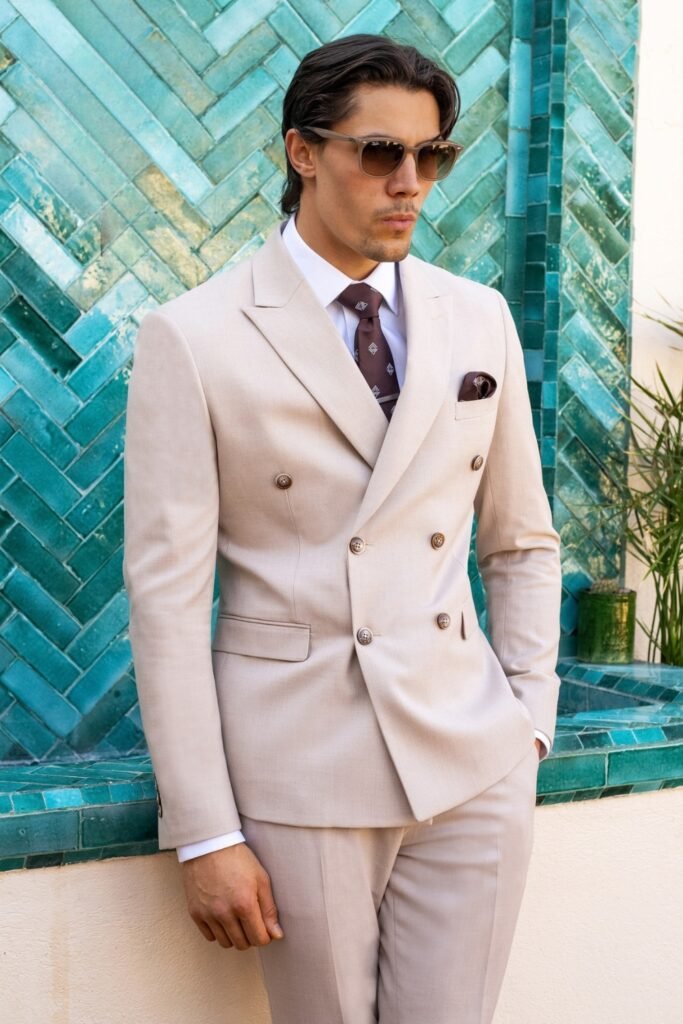 You can wear a light beige double-breasted suit with a soft-toned shirt and tie to feel effortless and clean.