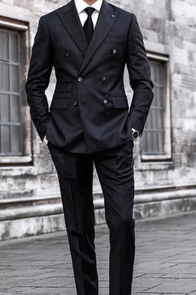 When you wear a black double-breasted suit, you instantly give yourself a sharp, no-risk formal look.